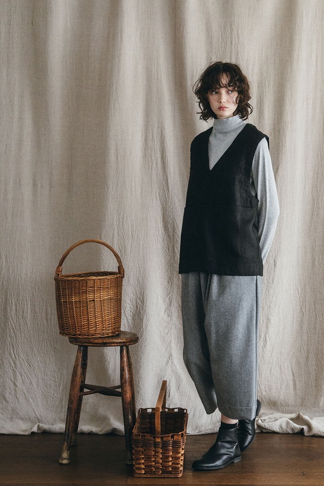 数年前から人気のジレ。 厚手のリネンのこちらのジレはどんな服にも似合うデザインで、さすがfogさん!と 展示会で飛びついてしまいました。 厚手のリネン生地で仕立てた、存在感のあるジレ。 深めのVネックとスリットポケットが大人っぽくきれいめな着こなしにもぴったりです。 広めにとったアームホールで、ワイドシルエットのシャツやボリュームのあるニットとも好相性。 ワイドパンツと合わせてマニッシュに、タイトスカートで女性らしく。合わせるアイテム次第で印象を変えられるのも魅力です。 いつものコーディネートに重ねるだけで、ぐっとこなれた雰囲気に。 大人のおしゃれに、ひとさじの遊び心を添えてくれる一着です。 モデル身長_172㎝ linen 100% (厚地/thick) Length62,Chest108,Shoulder width42cm made in Lithuania 実店舗、他サイトでも販売しております。 販売時に在庫切れの際はご了承ください。