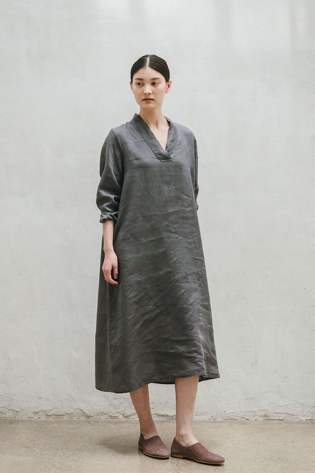 展示会でこのVネックラインに一目惚れして仕入れてみました。 これからの秋冬の着こなしが楽しみになる、大人のワンピースだと思います。 この深めのVネックが顔周りをきれいにみせてくれます。 身体のラインを拾いにくいゆとりのあるAラインのシルエットも大人には嬉しいポイント。 リラックスした着心地ながらもすっきりと上品な印象になります。 1枚でさらっと着るだけでスタイリングが決まって重宝しそう。 パンツに合わせたりレイヤードスタイルを楽しんでいただけたら嬉しいです。 両サイドポケット付きです。 linen 100% (薄地/sheer) Length115,Chest112,Sleeve53,Shoulder37cm made in Lithuania