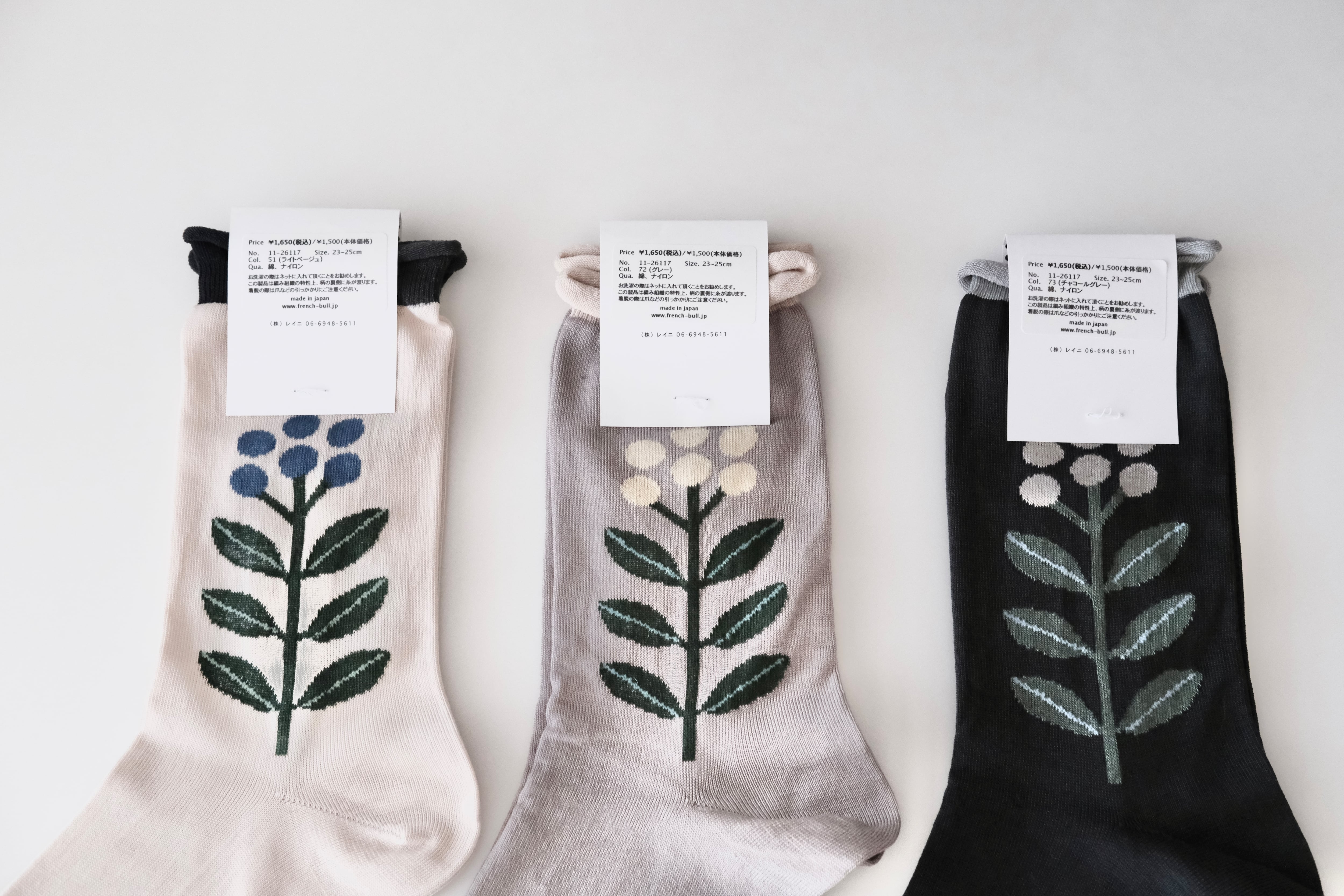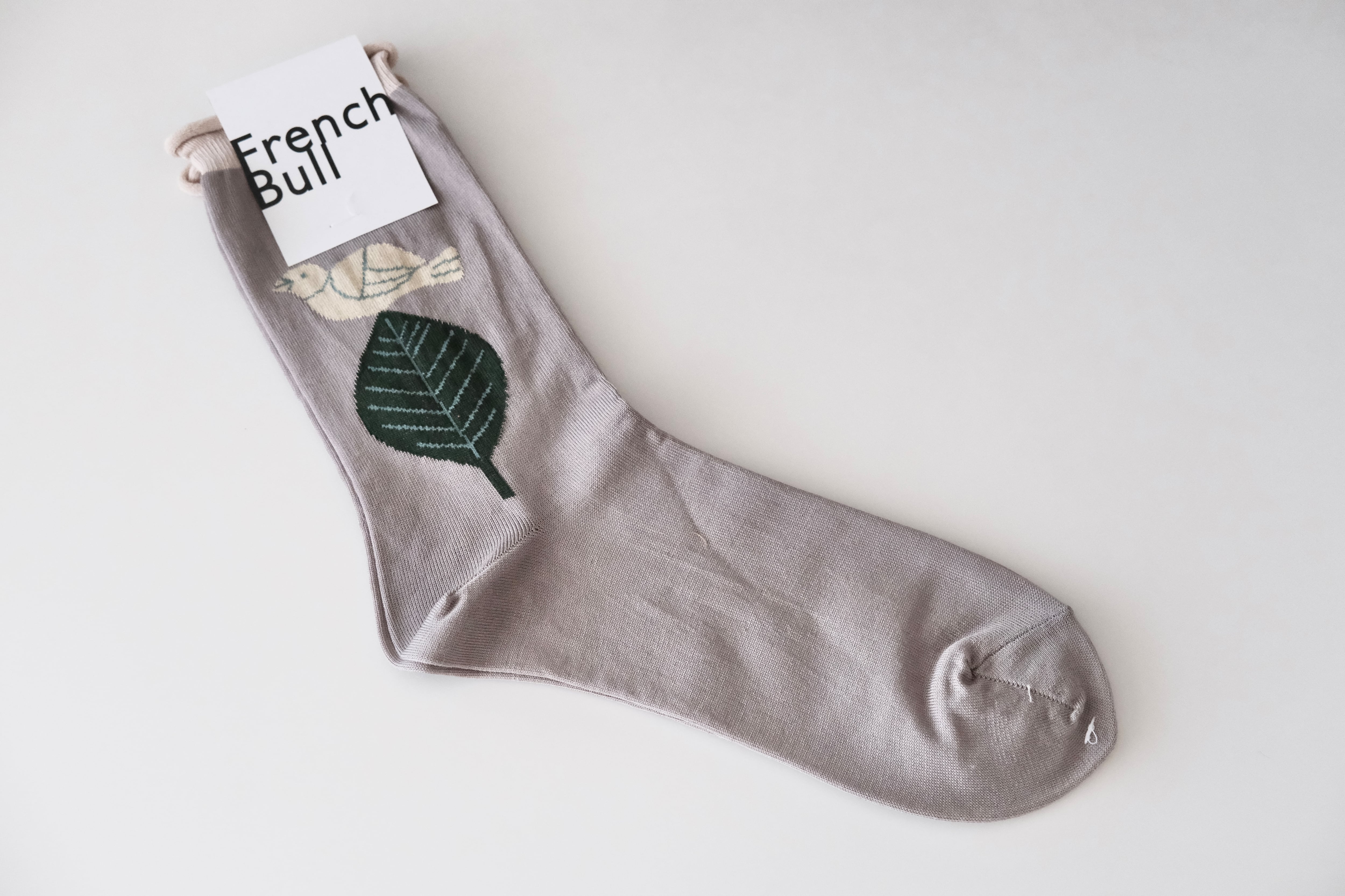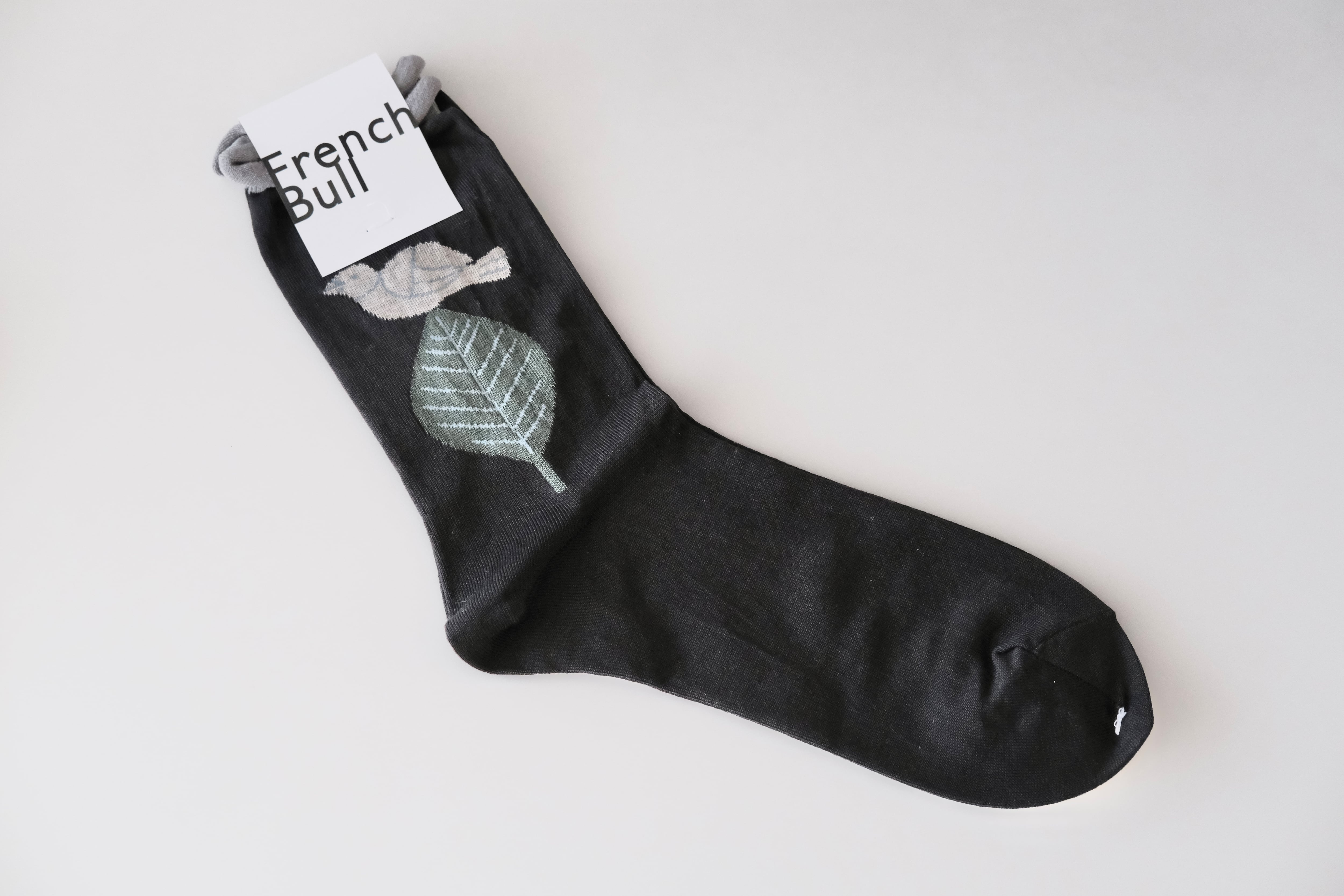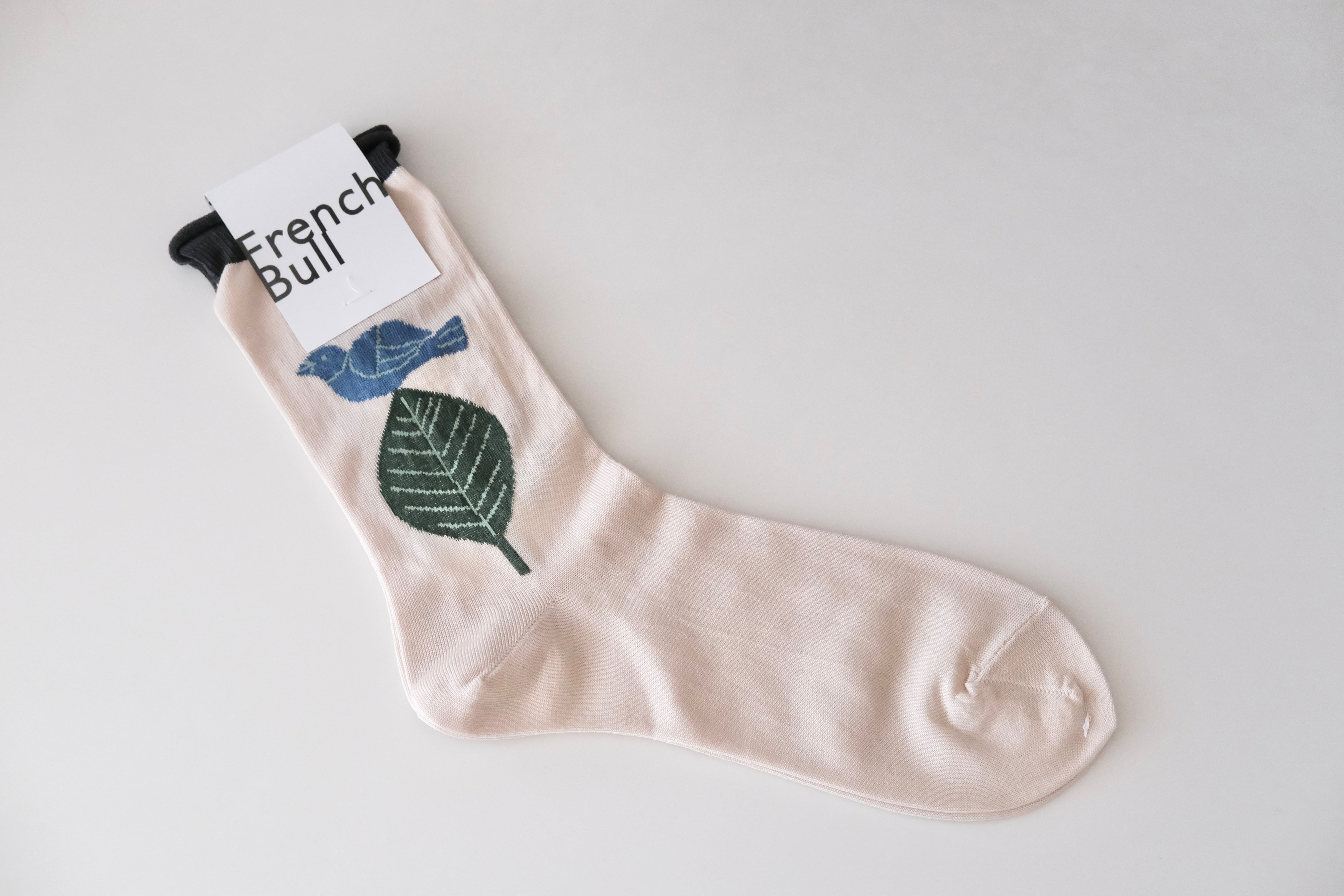 鳥と植物がモチーフの、左右で柄が変わるソックス。